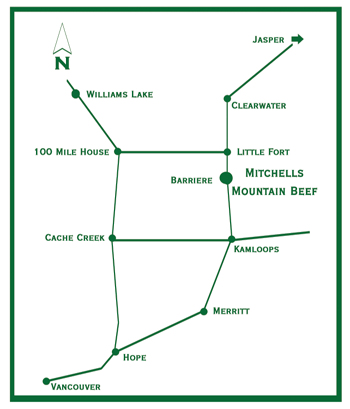 We are 66km north of Kamloops on Hwy. 5 and 2km north of Barriere, look for the Mitchell Cattle Co. sign on the right, 1km after you cross the North Thompson River.